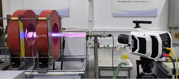 螺旋波等离子体放电装置。红色线圈是磁场线圈,中间是放电的石英玻璃管,通过石英玻璃管上的射频天线使得等离子体放电,与磁场耦合从而产生密度极高的蓝心,是螺旋波放电模式产生的标志。右侧为高速摄像机可以观测等离子体模式转化的变化。