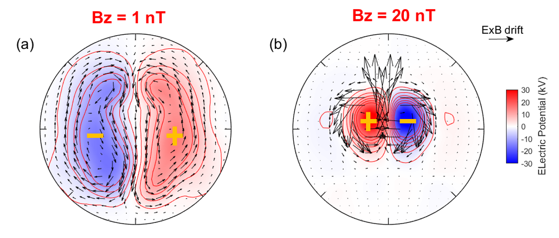 与此同时,极区出现了正负电势中心,而电势的极大和极小值之间的差值被称为“跨极盖电势”,这是空间天气状态的重要指标之一。