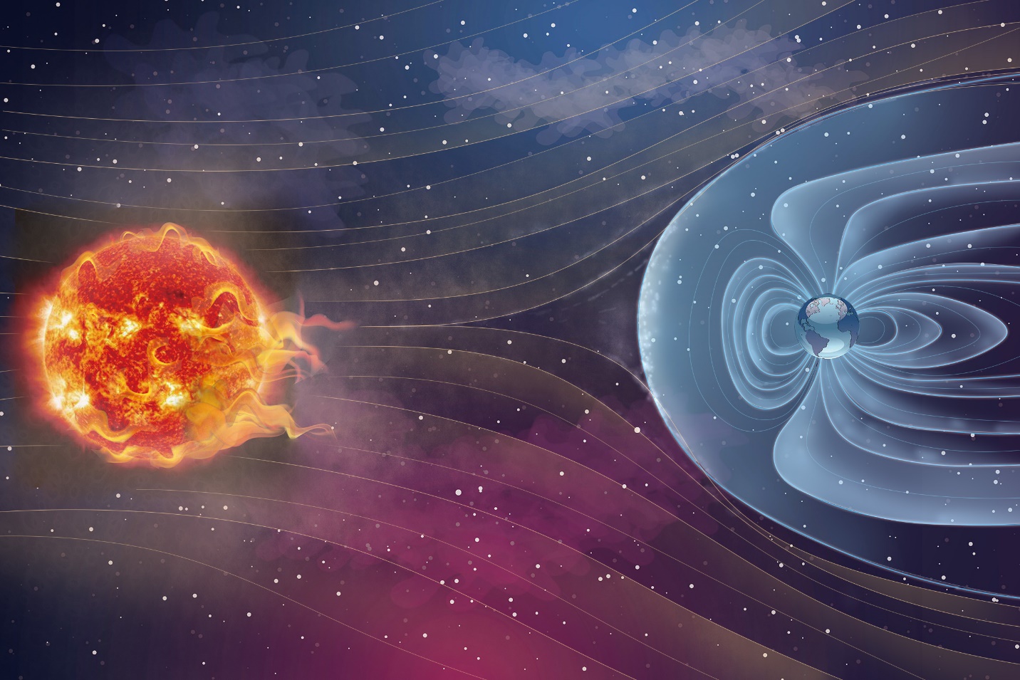 太阳风裹挟着从太阳中释放出的高能带电粒子吹向地球。而地球磁层这个天然的“保护伞”,可以把太阳风中的大部分带电粒子挡在地球以外,使地球与外太空隔离开来。