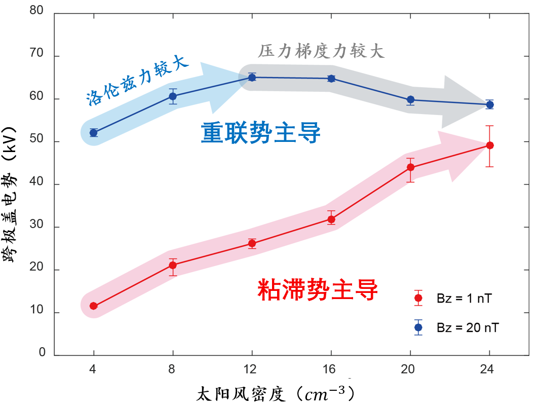 当太阳风密度较小时,磁鞘中的洛伦兹力较强,增大太阳风密度可以显著增加进入磁鞘的磁通量,从而增强跨极盖电势;